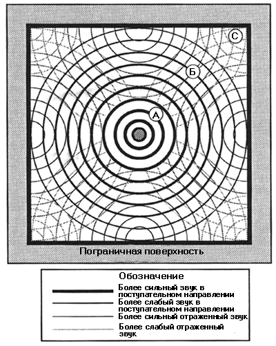 Критическое расстояниеМы уже отмечали, что поле звука, ревербирующее в помещении, равномерно распределено в пространстве. А вот будет ли в этом случае соблюдаться закон обратных квадратов? Чтобы ответить на этот вопрос, надо разобраться, чем отличается прямой звук (первоначальная звуковая волна, излучаемая источником звука до ее отражения) от реверберирующего звука. На рис. 6.5 показан ненаправленный громкоговоритель, излучающий звук в реверберующее поле. Прямой звук, идущий от громкоговорителя, распространяется в пространстве, и его интенсивность уменьшается в соответствии с законом обратных квадратов. Вначале прямых звуковых волн в пространстве намного больше (А), но по прошествии какого-то времени на определенном расстоянии от громкоговорителя в результате отражений интенсивности прямого и реверберирующего звука становятся равными (В). Наконец, на достаточно большом расстоянии от громкоговорителя реверберирующий звук доминирует и заглушает прямой (С). Расстояние от источника звука до той точки, в которой интенсивности реверберирующего и прямого звука становятся равными, называется "критическим расстоянием". По мере удаления от громкоговорителя, на расстояние, превышающее критическое (где доминирует реверберирующее поле), интенсивность звука выравнивается до статистически постоянной величины.