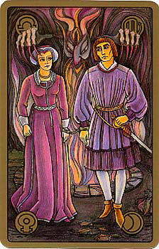 Пара плюс Искуситель. Пара попадает в лапы искусителя. Он связывает их цепями, отойдя при этом на задний план. Отсутствие свободы выбора. Тягостная зависимость. Черная магия (любовная). Всевозможные привороты и т.д. Связанность. Символы и цвета: Искуситель – зависимость Цепи – отсутствие выбора