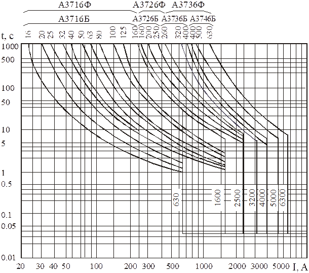 Рис. 4.8. Семейство защитных характеристик автоматических выключателей А3700 с комбинированными (термобиметаллическими и электромагнитными) расцепителями в исполнениях токоограничивающем – А3700Б и нетокоограничивающем – А3700Ф. 1. На кривых указаны номинальные токи расцепителей и уставки тока срабатывания их электромагнитных элементов. 2. Расцепители с номинальными токами 32-160 А включительно для выключателей 1-й величины по заказу поставляют с уставками тока мгновенного срабатывания 630 или 1600 А. 3. Кривые пригодны как для трехполюсных, так и для однополюсных выключателей переменного и постоянного токов при температуре окружающей среды 40 °С и прохождении тока по всем фазам (полюсам) выключателя.