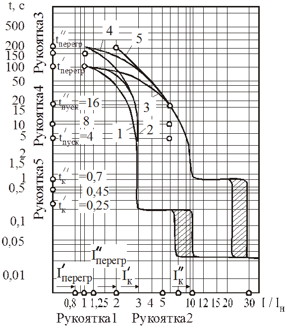 Рис. 4.9. Зоны возможных защитных характеристик полупрводниковых реле максимальной токовой защиты автоматических выключателей Точками обозначены уставки тока и времени, указанные на шкалах у регулировочных рукояток; фактически регулировку осуществляют плавно между минимальным (индекс – штрих) и максимальным (индекс – два штриха) значениями. 15. Автоматические выключатели серий ВА51-39 и ВА52-39 допускается использовать для прямых пусков и защиты АД. В зависимости от исполнения имеют разные сочетания расцепителей: тепловых, электромагнитных, независимых, нулевых и минимальных. 16. Автоматические выключатели типов ВА53-41; ВА55-41 и ВА56-41 допускается использовать для нечастых прямых пусков АД. Выключатели этих типов различаются по максимальной токовой защите (МТЗ): а) ВА53 – токоограничивающие с полупроводниковыми максимальными расцепителями тока для защиты в зоне токов перегрузки и КЗ и для защиты от однофазных замыканий; б) ВА55 – с полупроводниковыми максимальными расцепителями тока с выдержкой времени для защиты в зоне токов перегрузки и КЗ и для защиты от однофазных замыканий; в) ВА56 – без максимальных расцепителей тока, разработаны на базе выключателей серии ВА55. Выключатели с полупроводниковыми максимальными расцепителями тока в условиях эксплуатации допускают ступенчатую регулировку следующих параметров: номинального тока расцепителя I р.ном, номинального напряжения (только для постоянного тока); уставки по току срабатывания в зоне токов КЗ, уставки по времени срабатывания в зоне токов перегрузки при 6 I р.ном для переменного тока и 5 I р.ном для постоянного тока, уставки по времени срабатывания в зоне токов КЗ для выключателей типа ВА55-41. Выключатели с выдержкой времени в зоне токов КЗ типов ВА55-41 дополнительно имеют: 1 – верхнюю границу зоны селективности, кА: при переменном токе: 20,0; при постоянном токе: 30,0; 2 – кратность уставки по времени срабатывания в зоне токов КЗ до верхней границы зоны селективности, с: при переменном токе: 0,1; 0,2; 0,3; при постоянном токе: 0,1; 0,2. Полное время отключения электрической цепи в зоне токов КЗ выключателями типов ВА53, ВА55 (после истечения установленного времени срабатывания) и ВА56 (при токе КЗ не менее 25 кА для выключателей переменного тока, и не менее 40 кА для выключателей постоянного тока) не более 0,04с. 17. Автоматические выключатели типов ВА53-43, ВА55-43, ВА56-43 различают по МТЗ: а) ВА53 – токоограничивающие с полупроводниковыми и электромагнитными максимальными расцепителями тока без выдержки времени для защиты в зоне токов перегрузки и КЗ и для защиты от однофазных замыканий; б) ВА55-43 – с полупроводниковыми максимальными расцепителями тока с выдержкой времени для защиты в зоне токов перегрузки и КЗ и для защиты от однофазных замыканий; в) ВА56 – автоматические, без максимальных расцепителей тока, разработаны на базе выключателей серии ВА55. 18. Автоматические выключатели серии ВА75 имеют следующие расцепители: независимый, нулевой напряжения, минимальный напряжения с выдержкой времени. 19. Автоматические выключатели серий ВА81, ВА85, ВА87 предназначены для эксплуатации в электроустановках, а также допускается использовать их для прямых пусков АД с короткозамкнутым ротором и отключения вращающихся двигателей. Цифры в обозначении выключателей означают следующее: 81 – токоограничивающие выключате