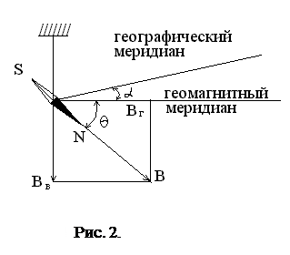 Угол между горизонтальной составляющей вектора В и плоскостью географического меридиана называется магнитным склонением α и измеряется при помощи деклинаторов. В результате неоднородности земного магнитного поля его вектор индукции на экваторе направлен строго горизонтально, на магнитных полюсах – вертикально, а на всех остальных широтах – под некоторым углом к горизонту. Этот угол называется магнитным наклонением θ, которое измеряется посредством инклинаторов. Существование магнитного наклонения приводит к тому, что северный полюс магнитной стрелки, подвешенной в северном полушарии, располагается несколько ниже южного полюса, а в южном полушарии – наоборот (на глаз это незаметно). Такую ориентацию можно описать векторной суммой горизонтальной и вертикальной составляющих вектора индукции магнитного поля Земли (рис. 2). Вертикальную составляющую этого поля измеряют при помощи упомянутого выше инклинатора, а горизонтальную – при помощи тангенс-гальванометра. В стрелочном инклинаторе главной частью является магнитная стрелка с горизонтальной осью, проходящей через центр тяжести стрелки. Если вертикальную плоскость качания стрелки совместить с плоскостью магнитного меридиана, магнитная ось стрелки устанавливается по направлению вектора напряженности магнитного поля. Магнитное наклонение отсчитывается по вертикальному кругу с делениями. Более точные индукционные инклинаторы позволяют измерить наклонение с точностью до 0,1΄. В таком приборе индукционная катушка вращается вокруг оси, лежащей в плоскости ее витков. Прибор дает возможность ориентировать ось в любом направлении. Если она не совпадает с вектором напряженности магнитного поля Земли, то магнитный поток сквозь контур катушки при ее вращении меняется, и в ней индуцируется эдс. При совпадении оси вращения с направлением вектора напряженности поток сквозь ее контур остается постоянным, эдс не индуцируется, и включенный в цепь катушки чувствительный гальванометр не дает отклонений. Угол между горизонтальной плоскостью и осью катушки при отсутствии отклонений в гальванометре отсчитывается по вертикальному кругу, соединенному с осью катушки. Точные измерения показали, что в настоящее время горизонтальная составляющая вектора магнитной индукции B на поверхности планеты принимает значения от 0 до 41 мкТл, а полный вектор индукции B0 изменяется в пределах от +62 до –73 мкТл. Магнитное поле Земли меняется и во времени. В настоящее время магнитное поле планеты убывает примерно на 1% каждые 10 лет.