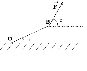 Доска ОВ длиной 6 м и массой 60 кг одним концом касается земли, а второй конец (В) удерживается в воздухе веревкой силой F. Доска образует с горизонтом угол a = 300, а веревка - угол j = 600. Найти: