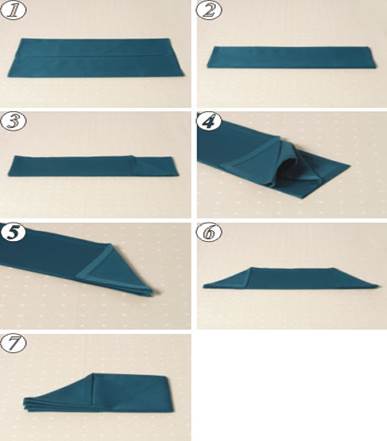 1. Исходно салфетка сложена вчетверо. 2. Отогните первый слой ткани салфетки по диагонали так, чтобы угол оказался в левой точке. Второй слой отогните так, чтобы второй угол оказался на расстоянии 1 дюйм (2,5 см) от первого. 3. Повторите вышеописанное с третьим и четвертым слоями ткани так, чтобы все углы отстояли друг от друга на 1 дюйм (2,5 см). 4. Загните стороны вниз и кладите салфетку на стол.
