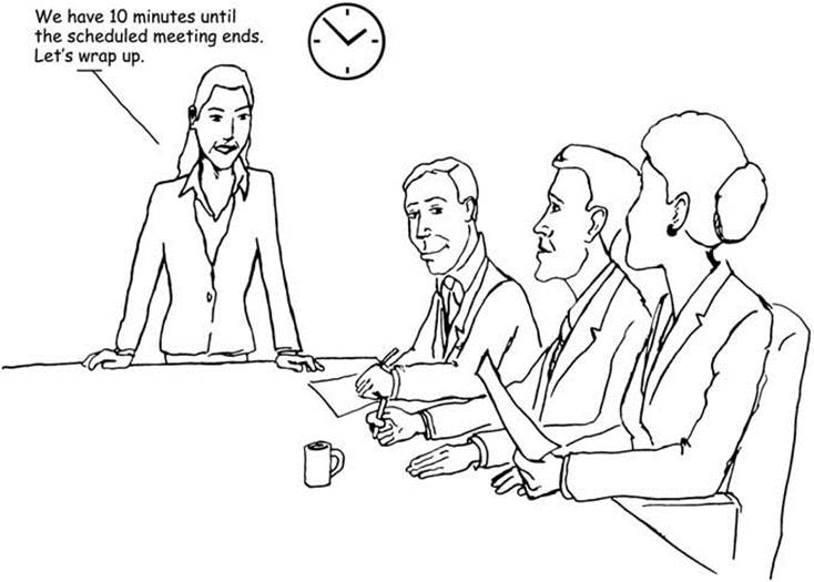 11. Как сделать совещания эффективными 309 перед началом или после окончания рабочего дня. Еще один вариант — проводить совещания «на ходу», ког- да в помещении нет стульев (в этом случае усталость не позволит слишком затянуть совещание). Рис. 11.2. Придерживайтесь графика проведения совещания До окончания совещания осталось 10 минут. Давайте заканчивать