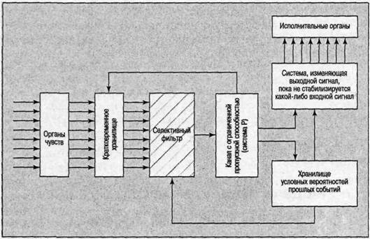 Глава З. Восприятие и внимание Модель с фильтрацией (Бродбент) Модели избирательного внимания Глава 3, Восприятие и внимание Целостную теорию внимания первым разработал британский ученый Бродбент (Broadbent, 1958). Эта теория, названная моделью с фильтрацией, была связана с так называемой «одноканальной теорией» и основывалась на идее о том, что обработка информации ограничена пропускной способностью канала — как гласила исходная теория обработки информации Клода Шеннона и Уоррена Вивера (Shannon & Weaver, 1949). Бродбент утверждал, что сообщения, проходящие по отдельному нерву, могут различаться в зависимости от того, какое из нервных волокон они стимулируют или какое количество нервных импульсов они производят. (Нейропсихологическими исследованиями было установлено, что сигналы высокой частоты и сигналы низкой частоты действительно передаются разными волокнами.) Так, в случае, когда несколько нервов возбуждаются одновременно, в мозг одновременно могут прийти несколько сенсорных сообщений. В модели Бродбента (рис. 3.8) такие сообщения обрабатываются несколькими параллельными сенсорными каналами. (Предполагается, что такие каналы имеют различные нервные коды и могут выбираться на основе такого кода. Например, два одновременно предъявляемых сигнала — высокой и низкой частоты — можно различить на основе их физических характеристик, даже если они оба достигают мозга в одно и то же время.) Дальнейшая обработка информации происходит только после того, как на этот сигнал будет направлено внимание и он будет передан через избирательный фильтр в канал с ограниченной пропускной способностью. На рис. 3.8 мы видим, что в систему входит больше информации, чем может быть обработано каналом с ограниченной пропускной способностью; Бродбент считал, что для исключения перегрузки системы избирательный фильтр можно переключить на какой-нибудь другой сенсорный канал. Модель с фильтрацией действительно выглядит правдоподобной. Очевидно, что наша способность к обработке информации ограниченна. Чтобы извлечь смысл из того, что мы слышим, наш мозг должен настроиться на один тип импульсов (на Рис. 3.8. Схема информационного потока, объединяющая взгляды, выраженные в различных современных теориях. Включает элементы теории Бродбента, не оговоренные в тексте. Адаптировано из: Broadbent, 1958