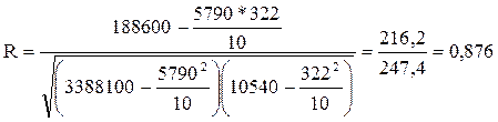 Все необходимые данные для определения коэффициента корреляции есть в таблице, их лишь остается подставить в необходимую формулу.
