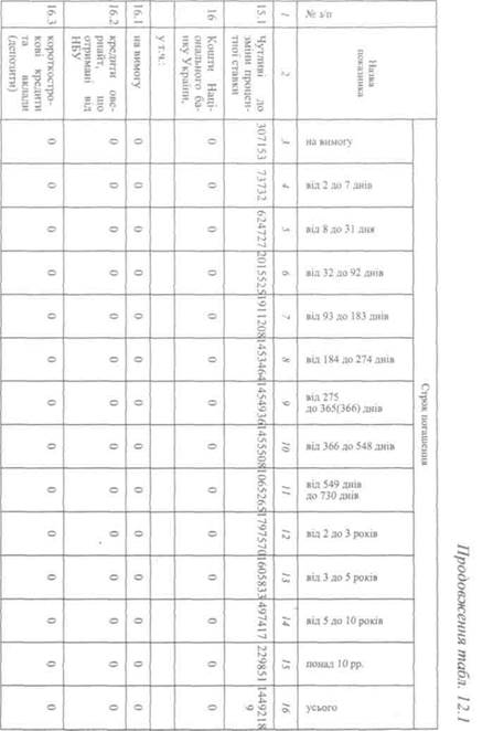 Література [1,4, 20, 90] Контрольні запитання 1. Які основні напрями визначення ліквідності існують? 2. Чим характеризується модель розуміння ліквідності як 3. На чому ґрунтується розуміння ліквідності як «потоку»? 4. Що таке структурне розуміння ліквідності? 5. Як розраховується нетто-ліквідна позиція банку? 6. Що означає «пропозиція ліквідних коштів»? 7. Що включає «попит на ліквідні кошти»? 8. Які коефіцієнти використовуються для аналізу ліквідності? 9. Які існують методи оцінки потреби банку в ліквідних засобах? 10. На чому заснований метод джерел і використання засо 11. На які категорії розподіляються депозити при використанні методу структури засобів прогнозування ліквідності? 12. У чому полягає удосконалений метод структури засобів прогнозування ліквідності? 1. За даними табл. 12.1 проаналізуйте ліквідну позицію банку.