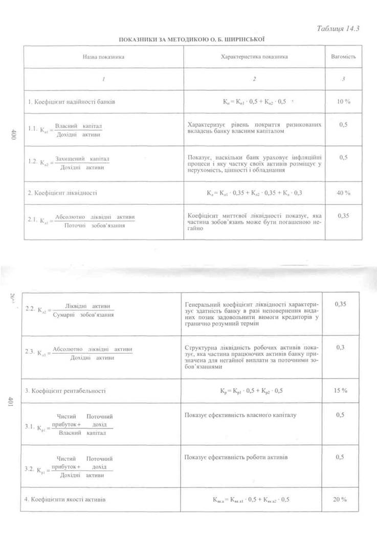 14.3.4. Методика рейтингової оцінки О. Б. Ширінської Наведемо ще одну методику рейтингової оцінки надійності банку, запропоновану О. Б. Ширінською, яка була впроваджена в практику вироблення лімітної політики «Кредитімпекс Банку». Зміст лімітної політики полягає в тому, що жоден банк не почне працювати зі своїм банком-контрагентом, доки не прорахує на нього ліміт. Ліміт показує, на скільки банк довіряє своєму партнерові, наскільки він готовий ризикувати і розміщувати у нього свої активи. Чим більше лімітів банк отримує на себе від своїх банків-колег, тим вищою вважається надійність і сталість його фінансового становища. Характеристика методики розрахунку рейтингових показників, що застосовуються для обчислення лімітів на банки, дається у табл. 14.3. Алгоритм цієї методики передбачає визначення 12-ти основних параметрів балансу кожного банку. Обчислюються п'ять видів диференційованих коефіцієнтів, що характеризують структуру активів і пасивів банку-контрагента, рівень його ліквідності, надійності та рентабельності. Далі визначається синтетичний коефіцієнт через систему зважених часткових коефіцієнтів за такою формулою Куз = Кн • 0,10 + Кл • 0,40 + Кр ■ 0,15 + Кка ■ 0,20 + Крб ■ 0,15. Недоліком подібних методик є суб'єктивне встановлення вагомості окремих показників, яке суттєво залежить від мети аналізу та користувачів інформації. 14.4. Прикладний аспект рейтингування банків в Україні Із практичної точки зору в Україні існує обмежений перелік консультативних структур, найбільш відомою з яких є компанія «Кредит-рейтинг». Агентство «Кредит-Рейтинг» — перше в Україні (з 2001 р.) спеціалізоване рейтингове агентство, яке надає послуги в області незалежної оцінки кредитоспроможності суб'єктів запозичень з привласненням кредитних рейтингів за українською національною шкалою. З 2003 р. рейтингові оцінки агентства офіційно визнаються Міністерством фінансів України. З 2004 р. «Кредит-Рейтинг» є уповноваженим агентством Державної комісії з цінних паперів і фондового ринку України для привласнення кредитних рейтингів суб'єктам господарювання, галузям економіки і регіонам.