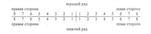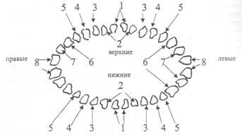 В верхнем и нижнем зубном ряду зубы по форме коронки подразделя ются на: резцы (1,2), клыки (3), малые коренные зубы (4,5) и большие корен ные зубы (зубы мудрости) (6,7,8).