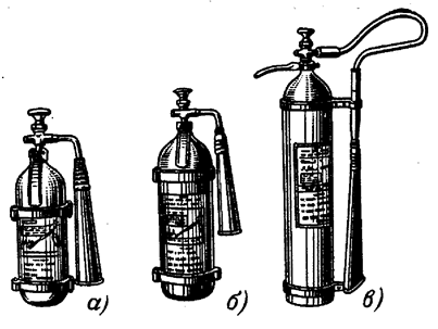 Принцип действия и порядок приведения огнетушителя ОВПУ-250 аналогичны огнетушителю ОВП-100. Огнетушитель работает при давлении 1,0 МПа (10 кгс/см2). Продолжительность действия 125 с. Масса огнетушителя с зарядом 470 кг. Объем раствора 250 л. Длина резинотканевого рукава 20 м. Длина струи 8-10 м. Углекислотные огнетушители служат для тушения загораний двигателей, топливных баков машин, электроустановок под напряжением, различных горючих веществ, за исключением тех, горение которых происходит без доступа воздуха, а также щелочных и магниевых сплавов. Углекислотные огнетушители выпускаются как ручные (ОУ-2, ОУ-5 и ОУ-8), так и передвижные (ОУ-25, ОУ-80 и ОУ-400). Ручные углекислотные огнетушители типов ОУ-2 (а), ОУ-5 (б) и ОУ-8 (в) (рисунок 3.7) одинаковы по устройству и каждый состоит из стального баллона, в горловину которого на конусной резьбе ввернуто запорно-пусковое устройство пистолетного или вентильного типа с сифонной трубкой, и раструба-снегообразователя.