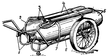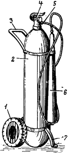 Для приведения в действие ручных огнетушителей необходимо направить раструб-снегообразователь на очаг пожара и открыть рычаг запорно-пускового устройства. При этом не следует переворачивать огнетушитель запорно-пусковым устройством вниз. Огнетушители работают при давлении 5,8 – 6,0 МПа (58-60 кгс/см2). Время непрерывного интенсивного действия при температуре 200С: ОУ-2 и ОУ-5 - 15 с, ОУ-8 – 20 с. Масса заряда огнетушителя: ОУ-2 – 1,4 кг, ОУ-5 – 3,5 кг и ОУ-8 5,6 кг. Длина струи при температуре 200С: ОУ-2 – 1,5 м, ОУ-5 – 2,9 м и ОУ-8 – 3,5 м. Длина резинотканевого рукава у огнетушителя ОУ-8 – 0,6 м. Передвижные огнетушители конструктивно отличаются друг от друга. Огнетушитель ОУ-25 (рисунок 3.8) состоит из баллона 2, смонтированного на двухколесном шасси 1. В горловину баллона ввернуто запорно-пусковое устройство 4. Устойчивость огнетушителя в вертикальном положении обеспечивается ножкой 7, которая вместе с колесами образует три точки опоры. Рукоятка 3 огнетушителя крепится непосредственно на баллоне с помощью хомута. Для образования снежной струи к запорно-пусковому устройству присоединен резинотканевый рукав 5 высокого давления с раструбом-снегообразователем 6. Огнетушитель работает при давлении 5,8-6 МПа (58-60 кгс/см2). Время непрерывного интенсивного действия при температуре 200С 20 с. Масса заряда огнетушителя 17,5 кг. Вместимость баллона 25 л. Длина резинотканевого рукава 3,4 м.