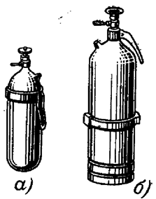 Огнетушитель состоит из тележки 6, двух баллонов 5, запорно-пускового устройства 1 с изогнутыми сифонными трубками, коллектора с двумя разводящими резинотканевыми рукавами 2, накидной шайбой и раструбами-снегообразователями 4, среднего кронштейна для крепления баллонов и заднего кронштейна с хомутом 7 для крепления баллонов и укладки резинотканевых рукавов. Тележка 6 выполнена в виде рамы из труб с двумя пневматическими колесами, опорами под баллоны и задней опорной стойкой. Раструбы огнетушителя имеют запорные краны 3, с помощью которых можно прекратить работу огнетушителя, не закрывая запорно-пусковых устройств. Огнетушитель работает при давлении 5,8-6 МПа (58-60 кгс/см2). Время непрерывного интенсивного действия при температуре 200С 50 с. Масса заряда огнетушителя 56 кг. Вместимость баллона 40 л. Длина резинотканевого рукава 10 м. Огнетушители ОУ-25 и ОУ-80 приводятся в действие усилиями двух-трех человек. Хладоновые огнетушители предназначены для тушения начальных пожаров различных веществ и материалов, а также электроустановок, находящихся под напряжением до 380 В. Они не пригодны для тушения щелочных, щелочноземельных металлов и материалов, горение которых происходит без доступа воздуха. Промышленностью выпускаются ручные хладоновые ОХ-3, углекислотно-бромэтиловые огнетушители ОУБ-3А (а) и ОУБ-7А (б) (рисунок 3.10).