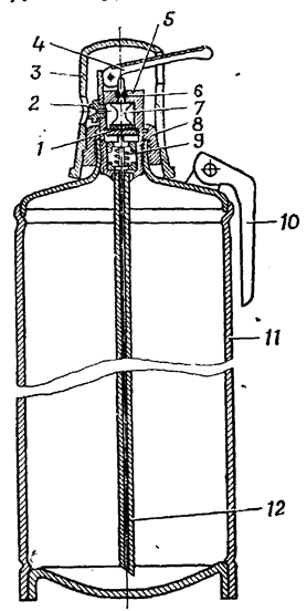Огнетушители ОХ-3, ОУБ-3А и ОУБ-7А (рисунок 3.11) одинаковы по устройству и отличаются друг от друга вместимостью баллона. Огнетушители состоят из клапана 1, распылительного насадка 2, колпака 3, пускового рычага 4, корпуса запорного устройства 5, уплотнительного кольца 6, штока 7, накидной гайки 8, пружины 9, рукоятки 10, корпуса 11 и сифонной трубки 12. Для приведения огнетушителя в действие необходимо взять его за рукоятку, нажать на рычаг и направить струю на очаг пожара.