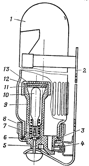 Огнетушители работают при давлении 1,7 МПа (17 кгс/см2). Время действия: ОХ-3 и ОУБ-3А - 20 с, ОУБ-7А – 30 с. Масса заряда: ОХ-3 – 3,7 кг, ОУБ-3А – 3,5 кг, ОУБ-7А - 8 кг. Дальность струи: ОХ-3 – 3 м, ОУБ-3А – 3-4 м, ОУБ-7А – 4 м. Порошковые огнетушители служат для тушения небольших загораний лекговоспламеняющихся и горючих жидкостей, щелочно-земельных металлов и электроустановок под напряжением. Они выпускаются ручными типа ОП-1 «Момент», ОП-10 и передвижными ОП-100. Огнетушитель ОП-1 «Момент» (рисунок 3.12) состоит из корпуса 1, кронштейна 2, прокладки 3, насадка с колпачком 4, бойка с головкой 5, уплотнительного кольца 6, пружины 7, крышки 8, стакана 9, баллончика для рабочего газа 10, диафрагмы 11, слоя поропласта 12 и крышки 13. Для приведения огнетушителя в действие необходимо снять с него кронштейн 2, перевернуть вниз запорно-пусковым устройством, ударить по головке бойка 5 и направить струю порошка в очаг пожара.
