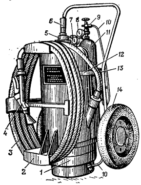 Огнетушитель ОП-10 (рисунок 3.13) состоит из корпуса 1, сифонной трубки 2, пробки 3, насадки 4, крышки с запорно-пусковым устройством 5, рукоятки 6, пускового рычага 7, держателя 8, штока 9, баллона для рабочего газа 10, трубки подвода рабочего газа 11, пористой перегородки 12, резинового основания 13 и пластмассового башмака 14. Для приведения огнетушителя в действие необходимо взять его за рукоятку 6, нажать на пусковой рычаг 7 и направить струю порошка в очаг пожара. Огнетушитель ОП-100 (рисунок 3.14) состоит из корпуса 1, каркаса 2, рукава 3, выпускного клапана 4, крышки 5, предохранительного клапана 6, манометра 7, манометра баллона с рабочим газом 8, запорного устройства 9, трубопроводов 10, баллона с рабочим газом 11, хомута 12, регулятора давления 13 и тележки 14. Для приведения огнетушителя в действие необходимо размотать резинотканевый рукав, снять пломбу, открыть запорное устройство баллона с рабочим газом, нажать на рычаг выпускного клапана и направить струю порошка в очаг пожара.