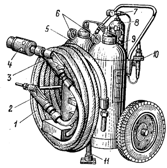 Для приведения огнетушителя в действие необходимо установить его в наклонном или вертикальном положении, размотать резинотканевый рукав в сторону очага пожара, открыть вентиль запорно-пускового устройства и направить струю пены в очаг пожара. Огнетушитель работает при давлении 0,8 МПа (8 кгс/см2). Продолжительность действия 90 с. Масса огнетушителя с зарядом 155 кг. Объем раствора 90 л. Длина резинотканевого рукава 5 м. Длина струи 5 м. Огнетушитель ОВПУ-250 (рисунок 3.6) состоит из пробкового крана 1, корпуса 2, заливного патрубка 3, баллона для рабочего газа 4, патрубка для контроля уровня жидкости 5, катушки с резинотканевым рукавом 6, предохранительного клапана 7, генератора пены 8, стойки 9, патрубка 10 и сливной трубы 11.