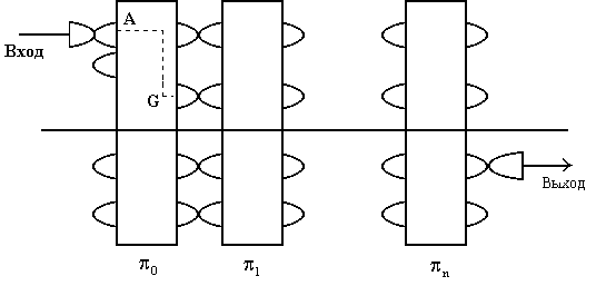 для представления открытого текста А, а шифрованный текст J окажется против того контакта ротора, который используется для представления шифрованного текста G, и результирующая подстановка Т(D) = G при j = 3. Алгебраически это записывается в виде Т (D) = С3pС-3 (D) = С3 p (А) = С3 (G) = J. Роторы можно объединить в банк роторов таким образом, чтобы выходные контакты одного ротора касались входных контактов следующего ротора. При этом электрический импульс от нажатой клавиши с буквой исходного текста, входящий с одного конца банка роторов, будет переставляться каждым из роторов, до тех пор, пока не покинет банк (рис. 14). Математически работу банка роторов можно описать в виде