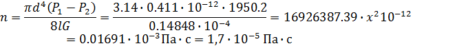 Обработка данных. Длина капилляра l=32 мм=0,032 м Диаметр капилляра 0,45 мм = 0,00045 м Объемный расход воздуха G=58 см3/с = 0,000058 м3/с