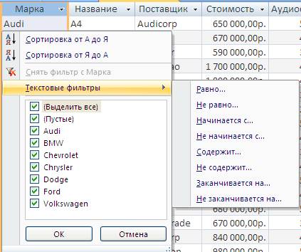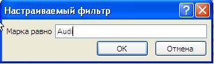 4. Например, для поиска записей с марками автомобилей Audi, необходимо выбрать пункт Равно. 5. Введите параметры фильтра в появившемся на экране окне диалога (рисунок 10). Для приведенного примера в поле ввода нужно ввести Audi.