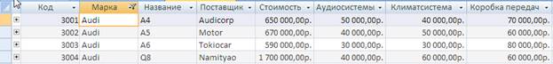 6. Нажмите кнопку ОК для фильтрации записей таблицы. В результате в таблице будут видны только те строки, у которых в поле «Марка» есть записи с названием марки Audi (см. рисунок 11)