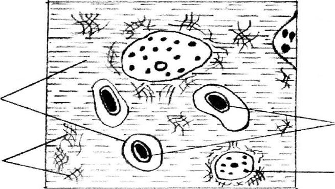 Рис. 1. Будова черепка фарфору: 1 — скловидна фаза; 2 — кристали муліту; З — кристали нерозчинного кварцу; 4 — пори