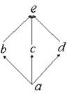Исследуем на дистрибутивность решетку, приведенную на рис.6.6. Проверим свойство дистрибутивности операции ∧ по отношению к операции ∨ x ∧ (y ∨ z) = (x ∧ y) ∨ (a ∧ z) для x = b, y = d и z = c. "Вычислим" левую часть этого выражения: x ∧ (y ∨ z) = b ∧ (d ∨ c) = b ∧ e = b. Теперь "вычислим" правую часть выражения: (x ∧ y) ∨ (a ∧ z) = (b ∧ d) ∨ (b ∧ c) = a ∨ a = a. Левая и правая части выражения различны, следовательно, рассмотренная решетка не дистрибутивна.
