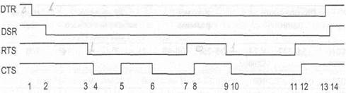 Рис.13.1.Последовательность управляющих сигналов интерфейса RS-232C Содержание этой последовательности управляющих сигналов следующее: 1. Установкой сигнала DTR компьютер указывает на желание использовать модем. 2. Установкой сигнала DSR модем сигнализирует о своей готовности к установлению соединения. 3. Сигналом RTS компьютер запрашивает разрешение на передачу и заявляет о своей готовности принимать данные от модема. 4. Сигналом CTS модем уведомляет о своей готовности к приему данных от компьютера и передаче их в линию. 5. Снятием сигнала CTS модем сигнализирует о невозможности дальнейшего приема (например, буфер заполнен) — компьютер должен приостановить передачу данных. 6. Восстановлением сигнала CTS модем разрешает компьютеру продолжить передачу (в буфере появилось место). 7. Снятие сигнала RTS может означать как заполнение буфера компьютера (модем должен приостановить передачу данных в компьютер), так и отсутствие данных для передачи в модем. Обычно в этом случае модем прекращает пересылку данных в компьютер. 8. Модем подтверждает снятие сигнала RTS сбросом сигнала CTS. 9. Компьютер повторно устанавливает сигнала RTS для возобновления передачи. 10.Модем подтверждает готовность к этим действиям. 11.Компьютер указывает на завершение обмена. 12.Модем отвечает подтверждением. 13.Компьютер снимает сигнала DTR, что обычно является сигналом на разрыв соединения («повесить трубку»). 14.Модем сбросом сигнала DSR сообщает о разрыве соединения.