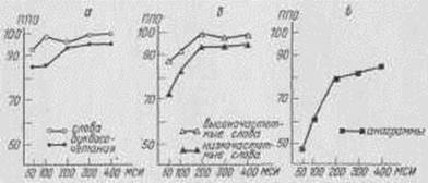 определялись величиной межстимульного интервала — она варьировала на пяти уровнях (50, 100, 200, 300, 400 мс). Время экспозиции одного стимула (буквы) во всех сериях было неизменным и составляло 50 мс. На рис. 20 представлены графики, отражающие зависимость успешности выполнения экспериментального задания от величины межстимульного интервала. В целом результаты демонстрируют общую тенденцию к улучшению правильности от- Рис. 20. Зависимость успешности выполнения методик: а) «воспроизведение букв», б) «называние слов» и в) «составление слов» от величины межстимульного материала ППО — процент правильных ответов. МСИ — межстимульный интервал (в мс). ветов по мере уменьшения скорости предъявления. Однако эта зависимость не линейна: правильность ответов возрастает только до некоторого критического значения величины межстимульного интервала (для всех методик оно равнялось 200 мс), после которого успешность работы стабилизируется. В методиках «воспроизведение буквосочетаний» и «называние слов» при этом достигался практически безошибочный уровень выполнения. В методике «составление слов» правильность ответов вообще существенно ниже, что отражает большую сложность данного задания, и на «стабильном» участке кривой не превышает 80—85%. Полученные данные задают диапазон временных режимов предъявления информации, которым целесообразно пользоваться при изучении влияния неблагоприят-, ных воздействий на успешность решения задачи. Обратимся к более детальному анализу выполнения каждой из методик. Полученные данные в задаче «воспроизведение букв» позволяют выдвинуть предположение о работе механизмов семантического анализа уже на этапе кратковременной обработки. Испытуемые практически всегда «узнают» осмысленное слово, даже без предварительного знания о возможности его появления. В связи с этим воспроизведение букв, входящих в состав слова, практически безошибочно (правиль-