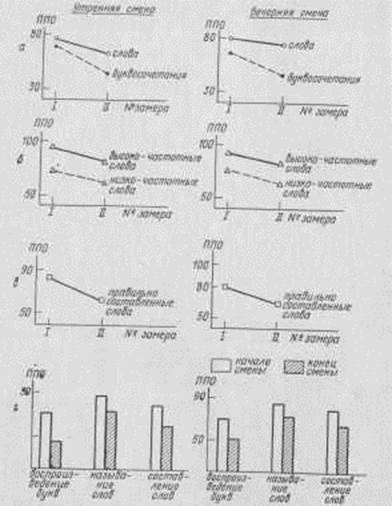 фистками выполняется задача на воспроизведение бессмысленных буквосочетаний. Влияние утомления, развивающееся в конце смены, сказывается на выполнении всех методик (рис. 21). Наблюдаются Рис. 21. Динамика успешности выполнения методик: а) «воспроизведение букв», б) «называние слов», в) «составление слов» и д) их усредненных показателей от начала к концу смены ППО — процент правильных ответов. значимые сдвиги успешности решения задач между замерами, проведенными в начале и конце каждой из смен (табл. 6). Особенно сильно страдает выполнение методик «воспроизведение букв» и «составление слов» (рис. 21,г).