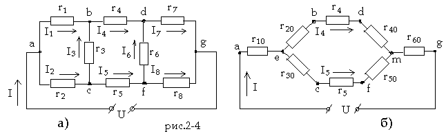 Найти эквивалентное сопротивление цепи (рис.2-4,а) и все токи, если U = 114 B, r1 = 30 ом, r2 = r3 = 10 ом, r4 = 26 ом, r5 = 11 ом, r6 = 10 ом, r7 = 40 ом, r8 = 50 ом. Решение задачи. Заменим треугольники сопротивлений abc и dfg эквивалентными звездами (рис.2-4,б). В преобразованной схеме появились новые узлы e и m. Обратим внимание на то, что в преобразованной схеме сохраняются значения токов I, I4, I5 в участках цепи, которые не подвергались преобразованию. Подсчитаем сопротивления лучей звезды r10, r20, r30, эквивалентной треугольнику abc сопротивлений r1, r2, r3.
