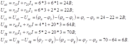 Теперь найдем токи в сопротивлениях заданной цепи. Для этого предварительно из схемы рис 2-4,б определим напряжения между точками a и b, a и с, с и b, d и g, f и g, f и d:
