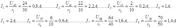 Используя записанные выше соотношения между токами контуров и ветвей, получаем значения токов ветвей: I1 = 0,24 A; I3 = 0,6 A; I2 = I22 – I11 = 0,6 – 0,24 = 0,36 A.