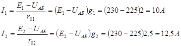 По закону Ома ток Мощности, развиваемые источниками: P1 = E1I1 = 230*10 = 2,30 кВт; P2 = E2I2 = 230*12,5 = 2,875 кВт. Мощности потерь на внутренних сопротивлениях: Мощность потребителя