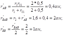 Для цепи рис.2-11 определить токи во всех участках и напряжения между узловыми точками А, Б и В при следующих данных: r1 = r3 = 2 ом; r2 = 1,6 ом; E1 = 3,6 B; E2 = 4,8 B; r01 = r02 = 0,5 ом.