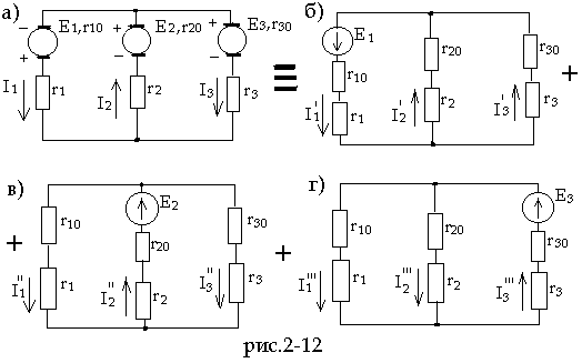 Решение задачи. Обозначим положительные направления токов исходной схемы на рис.2-12а). Предположим, что действует только э.д.с. E1, а э.д.с. E2 и E3 – недействующие (рис.2-12б). Тогда