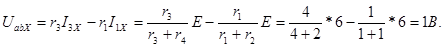 Определить ток в измерительной диагонали неуравновешенного моста (рис.2-14а), воспользовавшись методом эквивалентного генератора, если E = 6 B, r1 = r2 = 1 ком, r3 = 4 ком, r4 = 2 ком и r5 = 2,17 ком. Решение задачи.2 В соответствии с теоремой об эквивалентном генераторе воздействие всей цепи на рассматриваемую ветвь с сопротивлением r5 можно заменить воздействием эквивалентного генератора (рис.2-14б), э.д.с. Eэкв и внутреннее сопротивление rэкв которого равны Для определения напряжения Uab X разомкнем ветвь с сопротивлением r5 (рис.2-14в):