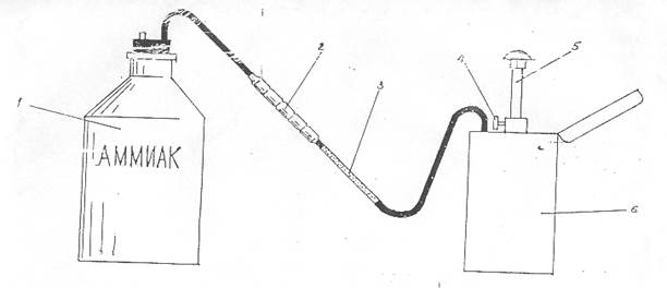 Рис.2.1. Лабораторная установка в сборе 1 – сосуд с загрязненным воздухом. 2 – фильтрующий патрон. 3 – индикаторная трубка. 4 – стопор. 5 – шток. 6 – воздухозаборное устройство.