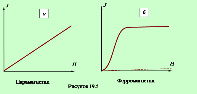 Аналогичный график для ферромагнетика показан на рисунке 19.5 б. Отметим, что в силу большой восприимчивости ферромагнетиков, на одном графике изобразить обе зависимости практически невозможно. Поэтому график в нижней части рисунка (для парамагнетика) должен практически слиться с осью абсцисс. Показанный на рисунке 19.5 б график, на котором в исходном состоянии ферромагнетик не имеет намагниченности называется основной кривой намагничения. Второй особенностью является наличие гистерезиса на зависимости В переменном поле зависимость