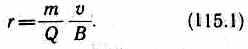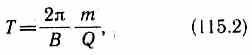 Период вращения частицы, т. е. время Т, затрачиваемое ею на один полный оборот, T = 2nr/v. Подставив сюда выражение (115.1), получим
