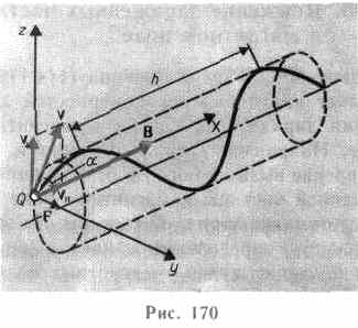 (Q/m) частицы, и магнитной индукцией поля, но не зависит от ее скорости (при v << с)). На этом основано действие циклических ускорителей заряженных частиц (см. §116). Если скорость v заряженной частицы направлена под углом а к вектору В (рис. 170), то ее движение можно представить в виде суперпозиции: 1) равномерного прямолинейного движения вдоль поля со скоростью v||=vcosa; 2) равномерного движения со скоростью v ┴= v sina по окружности в плоскости, перпендикулярной полю. Радиус окружности определяется формулой (115.1) (в данном случае надо заменить v на v┴=vsina). В результате сложения обоих движений возникает движение по спирали, ось которой параллельна магнитному полю (рис. 170). Шаг винтовой линии h=v || T=vT cosa. Подставив в последнее выражение (115.2), получим h=2pmv cosa/(BQ). Направление, в котором закручивается спираль, зависит от знака заряда частицы. Если скорость v заряженной частицы составляет угол а с направлением вектора В неоднородного магнитного поля, индукция которого возрастает в направлении движения частицы, то r и h уменьшаются с ростом В. На этом основана фокусировка заряженных частиц в магнитном поле.