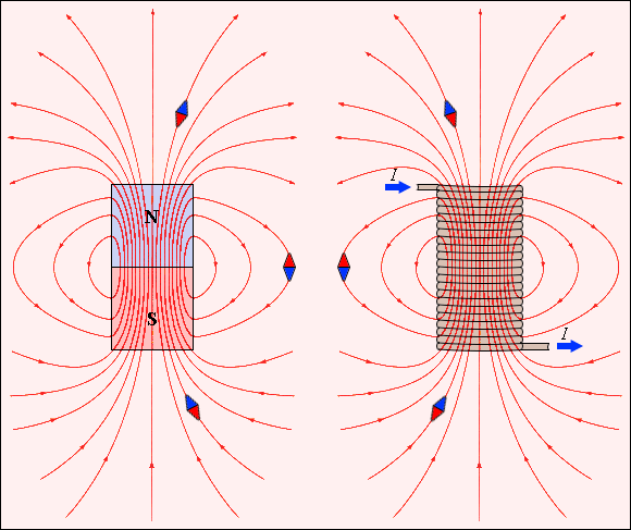 Обратите внимание на аналогию магнитных полей постоянного магнита и катушки с током. Линии магнитной индукции всегда замкнуты, они нигде не обрываются. Это означает, что магнитное поле не имеет источников – магнитных зарядов. Силовые поля, обладающие этим свойством, называются вихревыми. Картину магнитной индукции можно наблюдать с помощью мелких железных опилок, которые в магнитном поле намагничиваются и, подобно маленьким магнитным стрелкам, ориентируются вдоль линий индукции. Для того, чтобы количественно описать магнитное поле, нужно указать способ определения не только направления вектора
