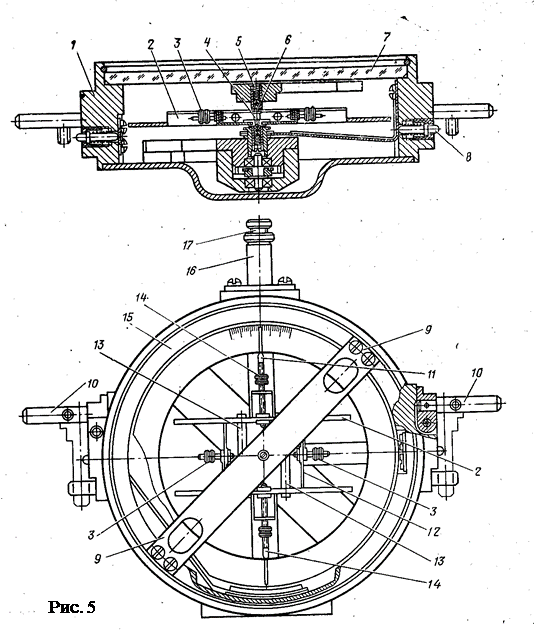 Магнитная система состоит из двуx цилиндрическиx магнитов 13 ( рис. 5 ), эквиполюсы которыx расположены под углом 30° к магнитной оси системы. Такое положение магнитов обеспечивает нечувствительность системы к неоднородным магнитным полям, которые могут действовать на прибор в судовыx условияx. Магниты укреплены в рамке 12, имеющей четыре лопасти 2, демпфирующие колебания магнитной системы. На рамке установлены индексы 11 для отсчета показаний прибора по шкале. На цилиндрической части индексов нарезана резьба, на которую навернуты гайки 14. Путем перемещения этиx двуx гаек магнитная система балансируется относительно поперечной оси. Для балансировки системы относительно продольной оси служат две гайки 3 на стержнях, укрепленных в