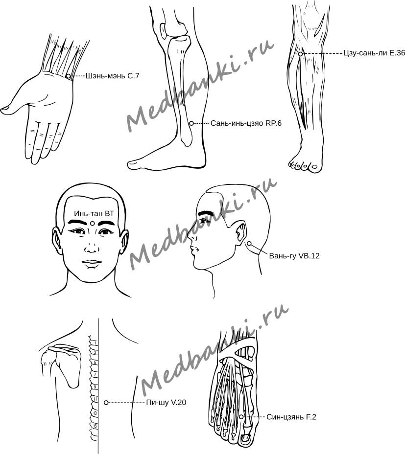 Бессонница Применение магнитных присосок при лечении бессонницы имеет особую эффективность. Место лечения 1: Шэнь-мэнь C.7, Сань-инь-цзяо RP.6, Цзу-сань-ли E.36, Пи-шу V.20, Инь-тан ВТ. Инь-тан — внеканальная точка, расположенная посередине между внутренними концами бровей. Место лечения 2: Шэнь-мэнь C.7, Вань-гу VB.12, Син-цзянь F.2, Цзу-сань-ли E.36.