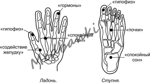 Методика: в каждой точке оставляют присоску на 15 минут, лечение проводят 1—2 раза в день, курс лечения — 10 дней, после курса лечения — 1—3 дня перерыв, затем проводится следующий курс лечения. Перед лечением пациенту следует выпить несколько глотков омагниченной воды. Во время лечения производится расслабление всего тела, глубокие выдохи и вдохи (см. гл. 1 п. 3 «Способы применения и методы укалывания».). Рефлексогенные зоны на кисти и стопе: производят постановку магнитных присосок на 10—15 минут в зонах «почки», «гипофиз», «гормоны», «спокойный сон» и «содействие желудку» на кисти и в зонах «почки», «спокойный сон» и «гипофиз» на стопе (см. рис. 31). Перед лечением на стопе моют ноги в теплой подсоленной воде. При ощущении ослабления энергии в любое время можно производить постановку присосок на кисти в точке «содействие желудку». При напряженном душевном состоянии произойдет постепенное расслабление. Когда в теле ощущается дискомфорт, при надавливании на точку возникает ощущение необычайного комфорта.
