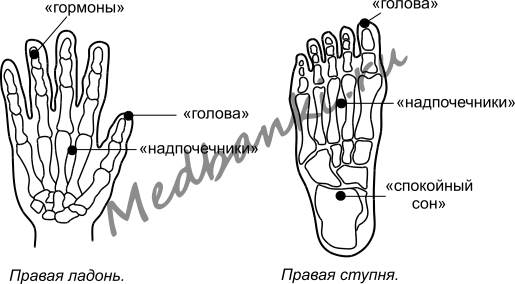 Методика: в каждой точке оставляют присоску на 15 минут, лечение проводят 1—2 раза в день, курс лечения — 10 дней, после курса лечения — 1—3 дня перерыв, затем проводится следующий курс лечения. Перед лечением пациенту следует выпить несколько глотков омагниченной воды. Во время лечения производится расслабление всего тела, глубокие выдохи и вдохи (см. гл. 1 п. 3 «Способы применения и методы укалывания».). Рефлексогенные зоны на кисти и стопе: производят постановку магнитных присосок на 10—15 минут в зонах «надпочечники», «голова», «гормоны» и «спокойный сон» на кисти и стопе (см. рис. 32). На кончиках пальцев можно применять метод точечного надавливания (свыше 36 надавливаний). Перед лечением на стопе моют ноги в теплой подсоленной воде.