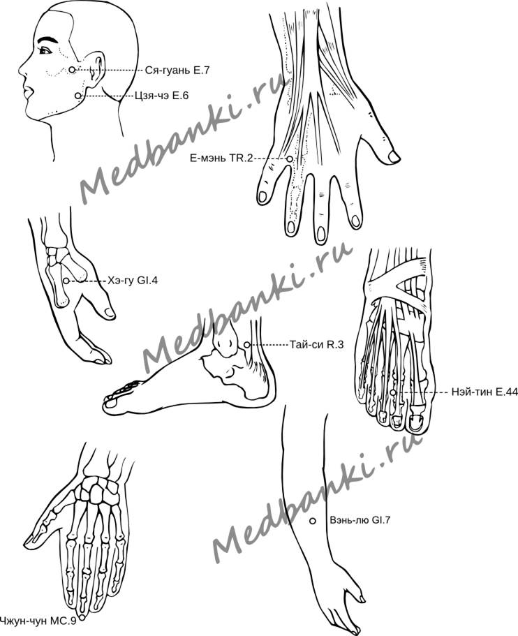 Зубная боль Распространенный симптом многих заболеваний полости рта. Может возникнуть при кариесе, пульпите и других болезнях зубов. Традиционная китайская медицина считает, что причинами зубной боли являются ветер-жар, огонь в желудке и кариес. Магнитные присоски особо эффективны при лечении зубной боли. Места лечения 1: Ся-гуань E.7, Цзя-чэ E.6, Е-мэнь TR.2, Хэ-гу GI.4, Тай-си R.3, Нэй-тин E.44, точки А-ши. Под точками А-ши подразумеваются места боли. Лечение можно производить несколько раз в день. Устанавливают присоски и во время боли, обычно боль вскоре проходит. Места лечения 2: Вэнь-лю GI.7, Чжун-чун MC.9. Места лечения 2 предложены японскими специалистами для лечения зубной боли. Применяют метод точечного надавливания магнитным наконечником присоски (свыше 36 надавливаний). Обычно в месте раздражения возникают болевые ощущения. Зубная боль, как правило, проходит.