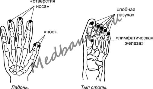 Методика: в каждой точке оставляют присоску на 15 минут, лечение проводят 1—2 раза в день, курс лечения — 10 дней. Перед лечением пациенту следует выпить несколько глотков омагниченной воды. Во время лечения производится расслабление всего тела, глубокие выдохи и вдохи (см. гл. 1 п. 3 «Способы применения и методы укалывания».). Рефлексогенные зоны на кисти и стопе: производят постановку магнитных присосок на 10—15 минут в зонах «нос» и «отверстия носа» на кисти и в зонах «лобная пазуха» и «лимфатическая железа» на стопе (см. рис. 78). В местах, где трудно устанавливать присоски, можно применять метод точечного надавливания (свыше 36 надавливаний).