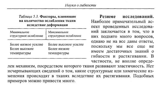 Lehmann, Koblanski, 1971,1976). Таким образом, при использовании метода растягивания с небольшой силой требуется больше времени, чтобы достичь такой же степени удлинения, как при использовании метода растягивания с большой силой. Однако процент удлинения ткани, который имеет место после устранения растягивающего усилия, оказывается выше при использовании продолжительного метода с небольшой силой (C.G.Warren и др., 1971, 1976). Кратковременное растягивание с большой силой способствует восстанавливающейся деформации эластичной ткани, тогда как продолжительное растягивание с небольшой силой —; остаточной, пластической деформации (С. G. Warren и др., 1971, 1976; Labon, 1962). Результаты лабораторных исследований показывают, что при постоянном удлинении структур соединительной ткани имеет место определенное механическое ослабление, хотя разрыв и не происходит (C.G.Warren и др., 1971, 1976). Степень ослабления зависит от способа растягивания ткани, а также от степени растяжения. Температура существенно влияет на механическое поведение соединительной ткани в условиях растягивающего напряжения. При повышении температуры ткани степень жесткости уменьшается, а степень растяжимости увеличивается (Laban, 1962; Rigby, 1964). Если температура сухожилия превышает 103°Ф, количество постоянного удлинения в результате данного количества исходного растягивания увеличивается (Laban, 1962; Lehmann, Masock, Warren u Koblanski, 1970). При температуре около 104° Ф происходит термальное изменение микроструктуры коллагена, которое значительно усиливает расслабление вязкости после нагрузки коллагеновои ткани, что обеспечивает более высокую пластическую деформацию при растягивании (Mason и Rigby, 1963). Механизм, лежащий в основе этого термального изменения, пока не известен, однако предполагают, что происходит частичная дестабилизация межмолекулярной связи, усиливающая вязкие свойства текучести коллагеновои ткани (Rigby, 1964). Если соединительную ткань растягивают при повышенной температуре, условия, в которых ткань может охладиться, в значительной мере могут повлиять на качество удлинения, которое остается после устранения действия растягивающего напряжения. После растяжения разогретой ткани сохраняющаяся растягивающая сила во время охлаждения ткани значительно увеличивает относительную пропорцию пластической деформации по сравнению с разгрузкой ткани при все еще повышенной температуре (Lehmann и др., 1970). Охлаждение ткани до устранения напряжения позволяет коллагеновои микроструктуре больше рестабилизироваться к ее новой длине (Lehmann и др., 1970).
