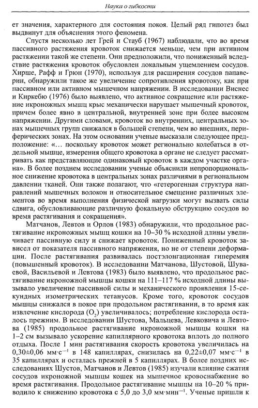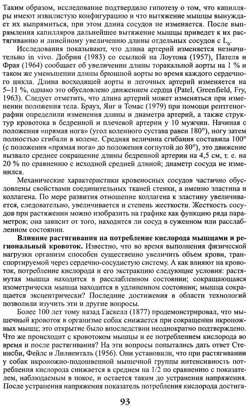 растяжение; оно не зависит от ЦНС и представляет собой механическое свойство растягиваемой ткани. С другой стороны, рефлекс растяжения представляет собой реакцию, обусловленную ЦНС, которая вынуждает растянутую мышцу сокращаться в ответ на стимул растяжения (Gowitzke и Milner, 1988). Одним из основных аргументов против использования баллистического растягивания является то, что оно вызывает рефлекс растяжения. Однако если выполнять такое растягивание при длине, превышающей 1,5 L0, то рефлекс растяжения не должен привести к увеличению напряжения в СК, поскольку при такой длине филаменты не способны соприкасаться и производить напряжение. Причем это справедливо только в том случае, если все саркомеры мышечного волокна растянуты в одинаковой степени. Но это происходит не всегда. Например, саркомеры, расположенные вблизи сухожилий, растягиваются значительно меньше тех, что находятся в середине мышцы, поэтому они могут проявлять рефлекс напряжения и влиять на степень растяжения. Таким образом, активация рефлекса растяжения, даже если длина мышечного волокна превышает 1,5 L0, по-видимому, приведет к производству дополнительного напряжения СК. Во время движения и особенно во время растягивания многочисленные структуры тела подвергаются воздействию различных сил. В первую очередь это соединительные ткани (например, сухожилия, связки и фасции) и мышцы. Однако не следует забывать и о двух других категориях структур — сердечно-сосудистой и нервной системах. В следующих разделах мы проанализируем влияние растягивания на эти структуры. Анатомия сердечно-сосудистой системы. Сердечно-сосудистая система состоит из многообразия кровеносных сосудов, по которым движется кровь через все тело. Существует три основных вида кровеносных сосудов: артерии, вены и капилляры. Артерия — кровеносный сосуд, по которому кровь идет от сердца. Все артерии (за исключением легочной и ее ответвлений) переносят насыщенную кислородом кровь. Артериальный сосуд, имеющий диаметр меньше 0,5 мм, называется артериолой. В зависимости от превалирующего компонента ткани в стенках артерий их можно разделить на эластичные и мышечные. Эластичными артериями являются такие крупные сосуды, как аорта, сонная, подключичная и подвздошная артерии. Подавляющее большинство артерий относится к категории мышечных. Посредством сужения и расширения артерий осуществляется регуляция кровотока (рис. 5.14). Вена — кровеносный сосуд, по которому кровь поступает к сердцу. Все вены (за исключением легочной) содержат дезоксигенированную кровь. Небольшие вены называются венудами.. Главное различие между венами и артериями — сравнительная слабость средней оболочки стенок вен. Значительно меньшее содержание в них мышечных и эластичных во- Наука о гибкости