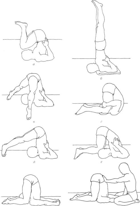 ж з Рис. 15.10. Стойка на плечах (а~б) и «плуг» (в-з) — упражнения, вызывающие неоднозначное отношение специалистов (Alter, 1990)